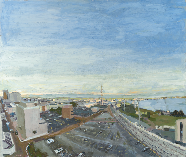 Mitchell Long, View of French Quarter from Canal Place Parking Garage, 2021, oil on board, 42" x 48"