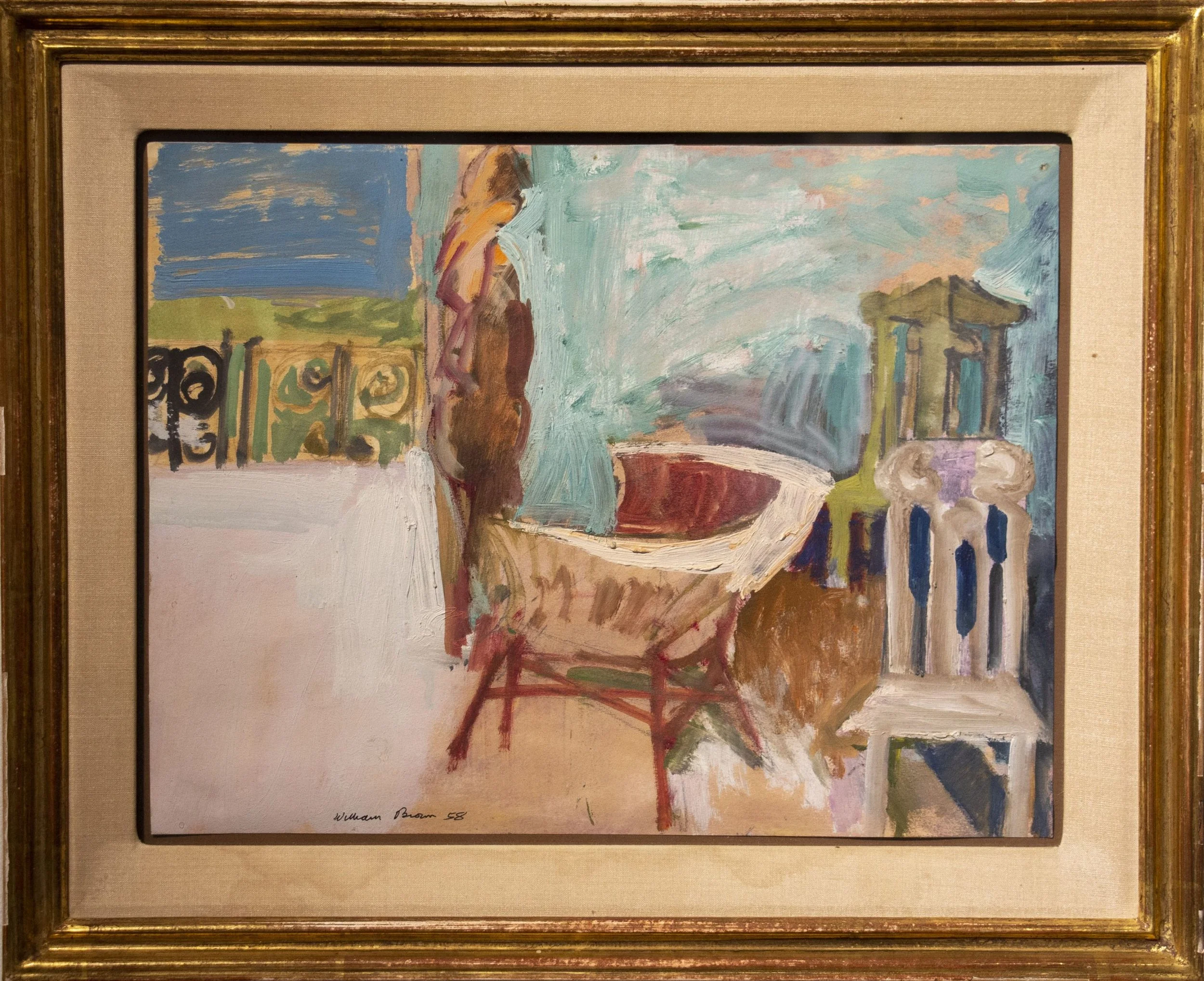 Theophilus Brown, Man with Three Chairs, 1958, Oil on canvas, 8" x 12"