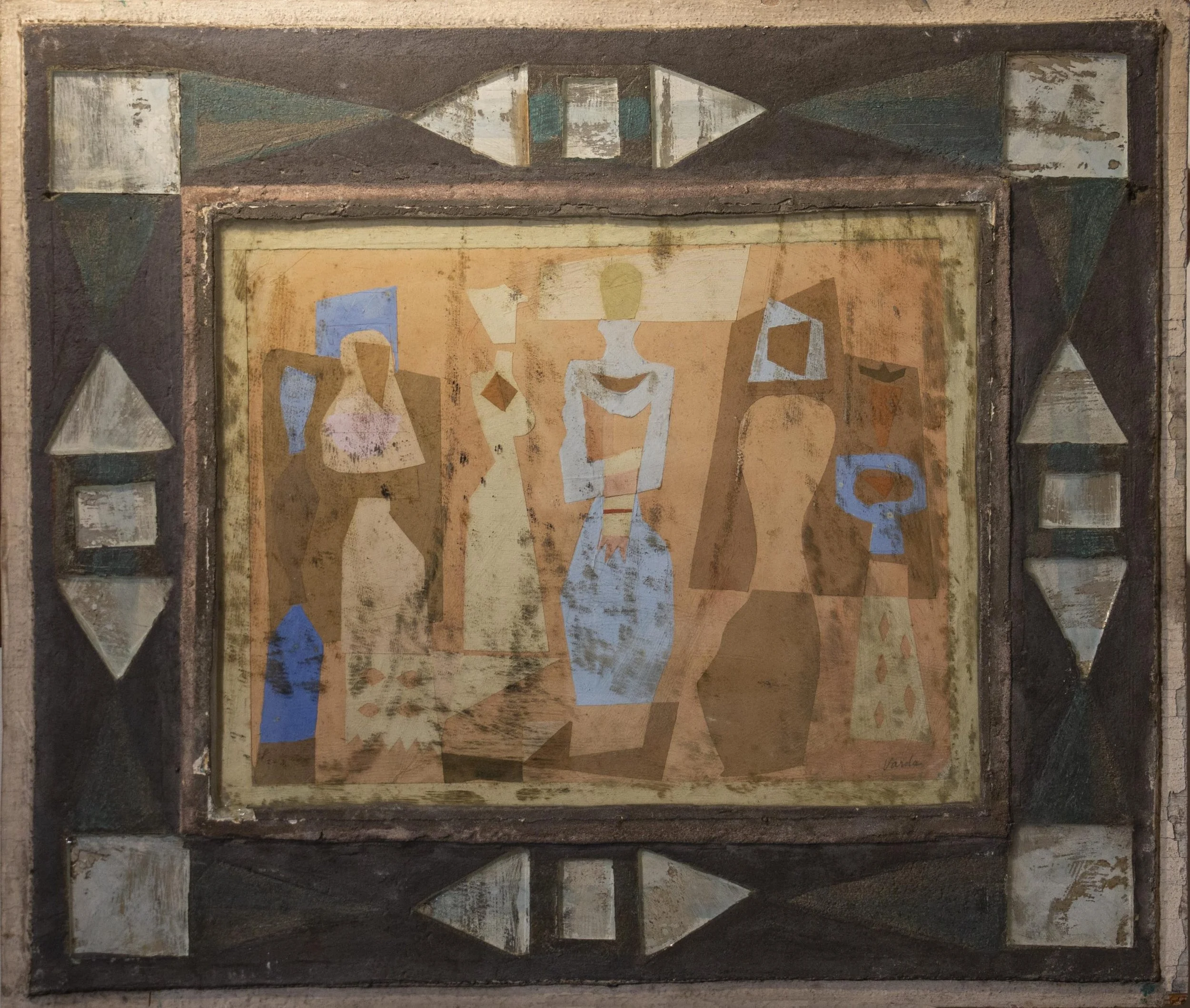 Jean Varda, Mirrored, 1951, Scratched glass, cement, paper, mixed media on plywood, 23.5" x 28.5"