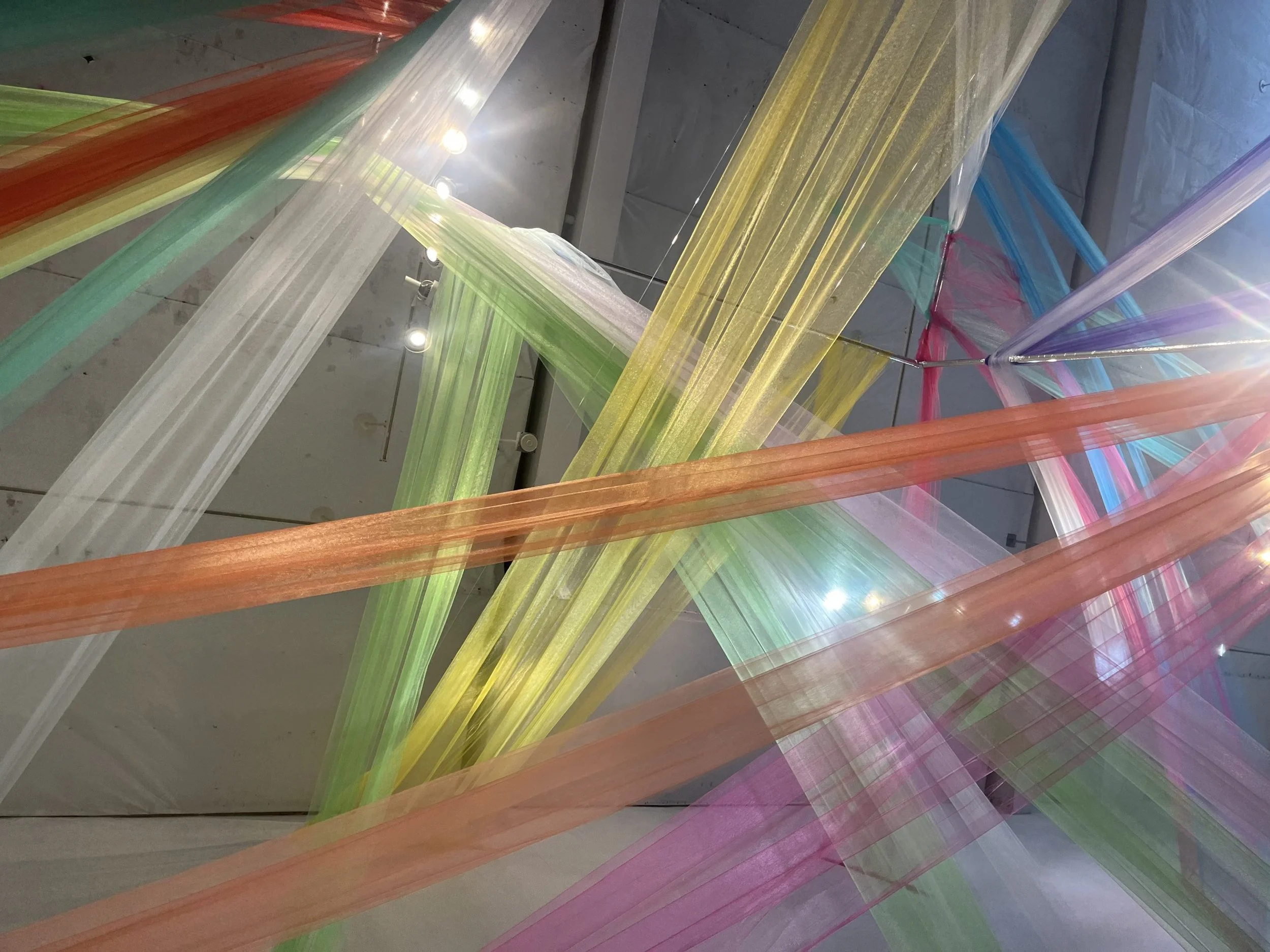 Kaltenbach’s geometric and hard-edged background alongside Yoo’s vibrance and softness makes for an incredible collaboration. Known for her inventive use of space and materials, her body of work reflects her blending of Eastern and Western aesthetics. She also works in diverse media, but fabric is often her choice-material. We see in the 2023 Venice Biennale that fabric has become a dominant part of modern art, so not only are they moving the history of conceptual art forward, but they are also breaking down the traditional white cube of a gallery and making it come alive. They both involve drawing in their installations, and this fusion of differing perspectives resulted in a third person that severed itself from the white cube, culminating in a more inclusive and immersive art experience that gives the viewer a chance to walk through the whole space.