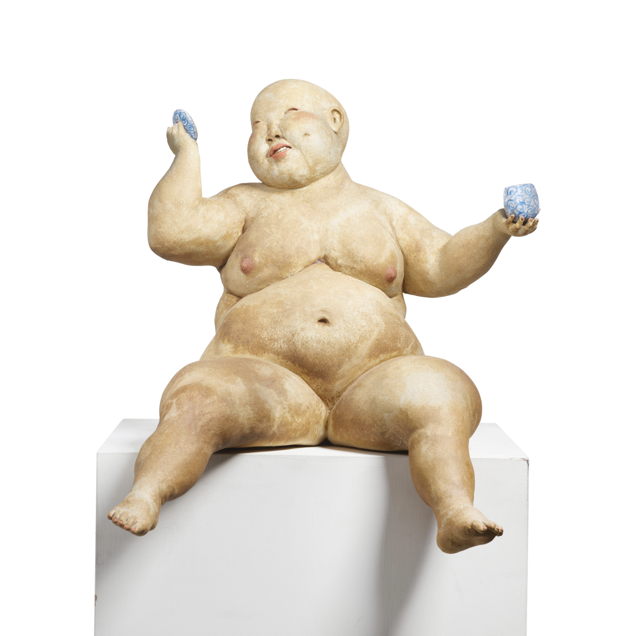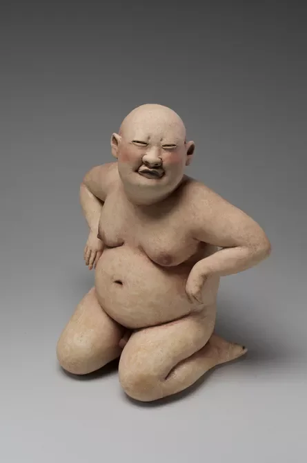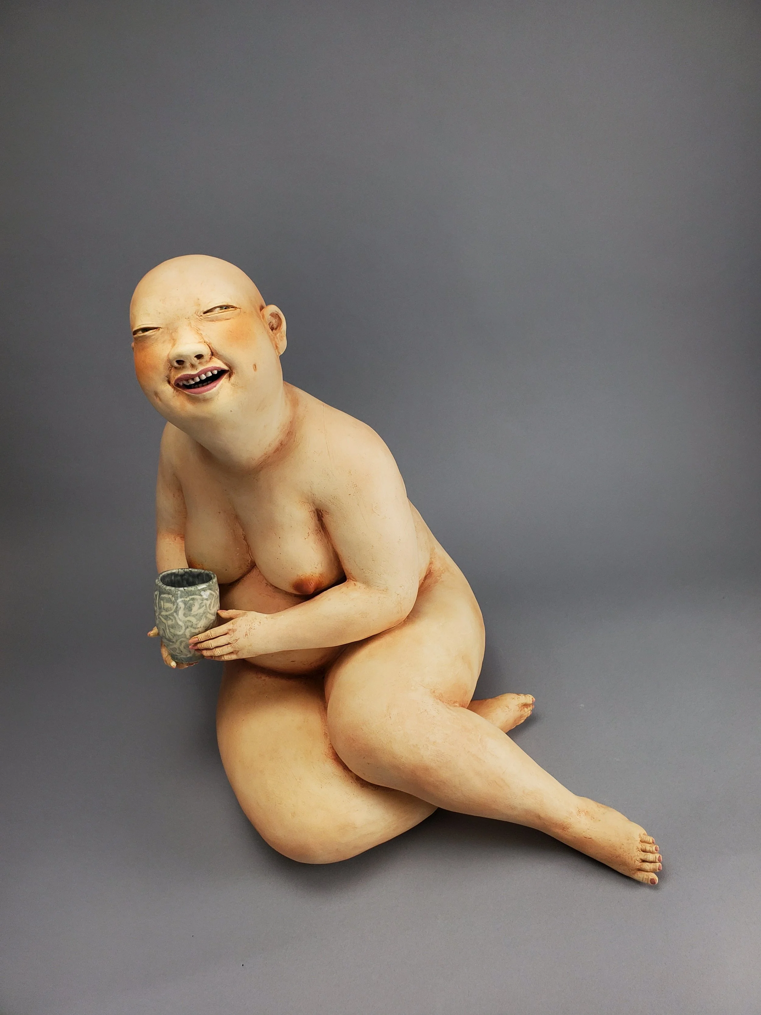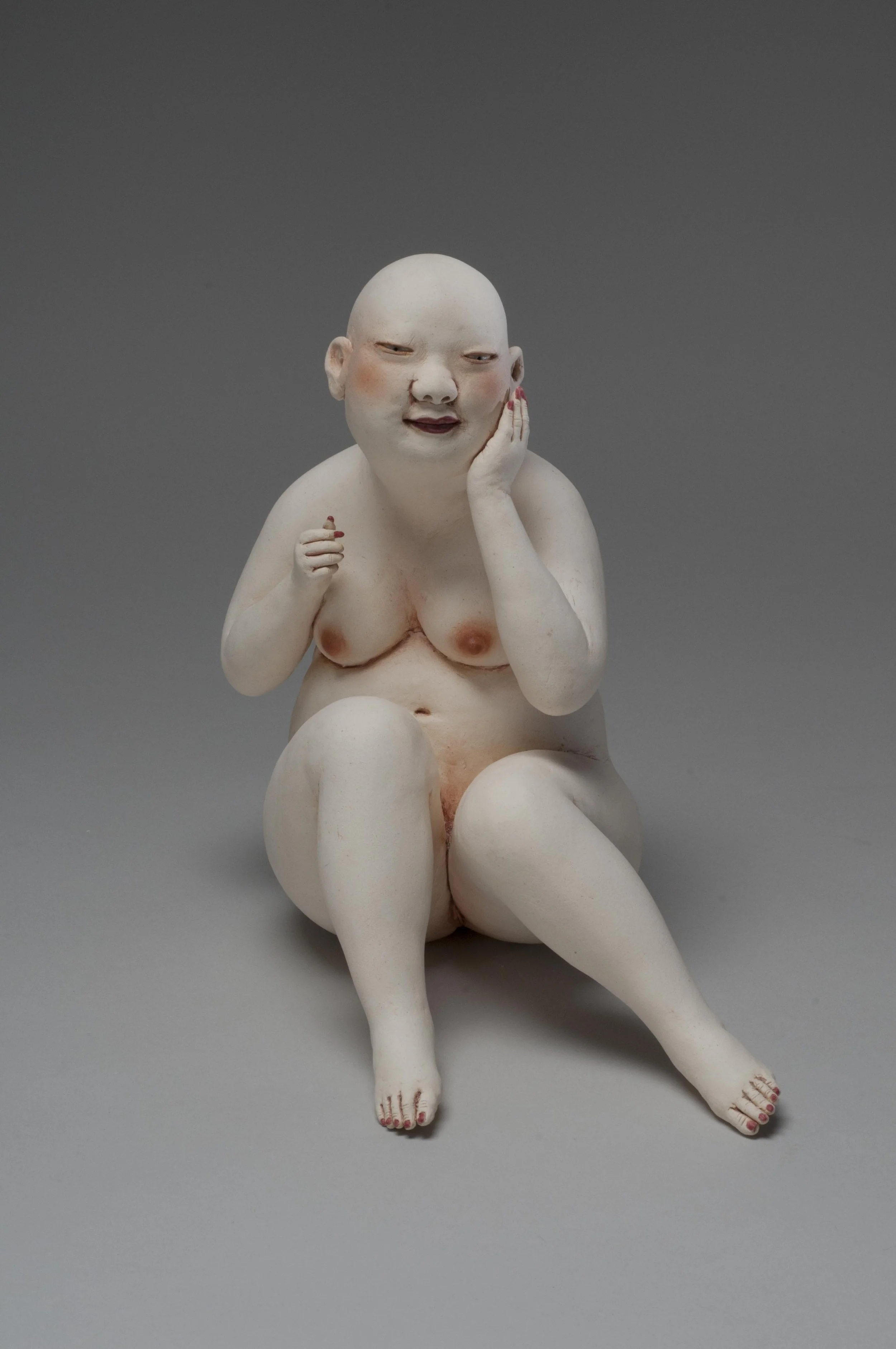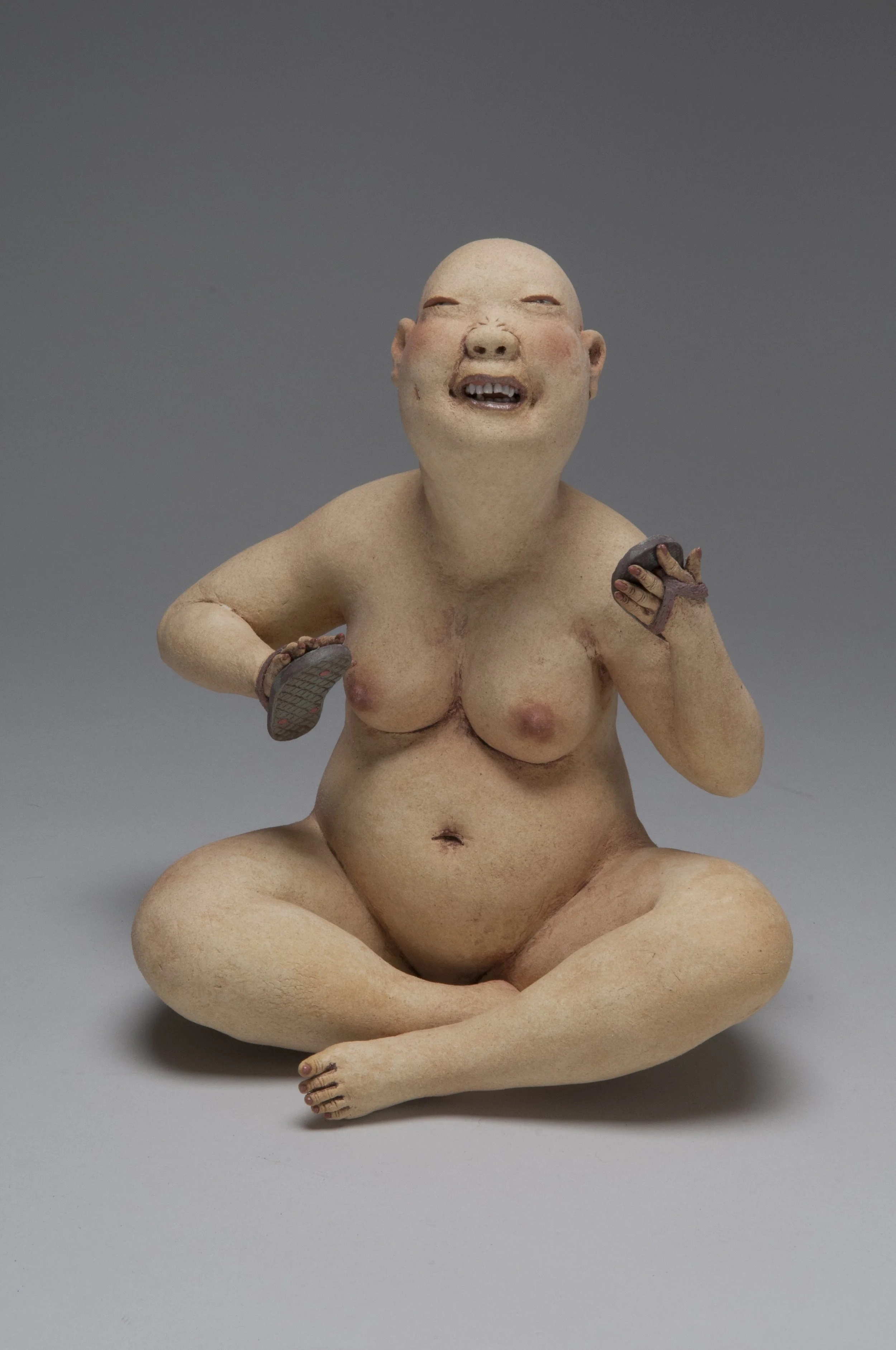 Over the years, Shimazu has established herself as one of Hawaii’s best-known artists. She received a Wallace Alexander Gerbode Foundation Purchase Award in 2001, and an Individual Artist Fellowship award from the Hawaii State Foundation on Culture and the Arts. Shimazu’s rise to success was not an isolated process, however. She drew inspiration from the great Toshiko Takaezu, also Japanese-American from Hawaii who left home to study on the mainland and in Japan. Shimazu’s work references Japanese culture often, specifically the delicate folding fans; ceramics itself is a medium rooted in Shimazu’s ancestry. Shimazu’s art is further influenced by her interest in nature, history, and family. In creating her distinctively charming stoneware pieces, she draws heavily from her experience as an Asian-American living in Hawaii. She is best known for her stoneware sculptures of bald, nude, chunky Asian women constructed with hand-building techniques. Her figures are created without complex details in order to accentuate their ceramic origins.